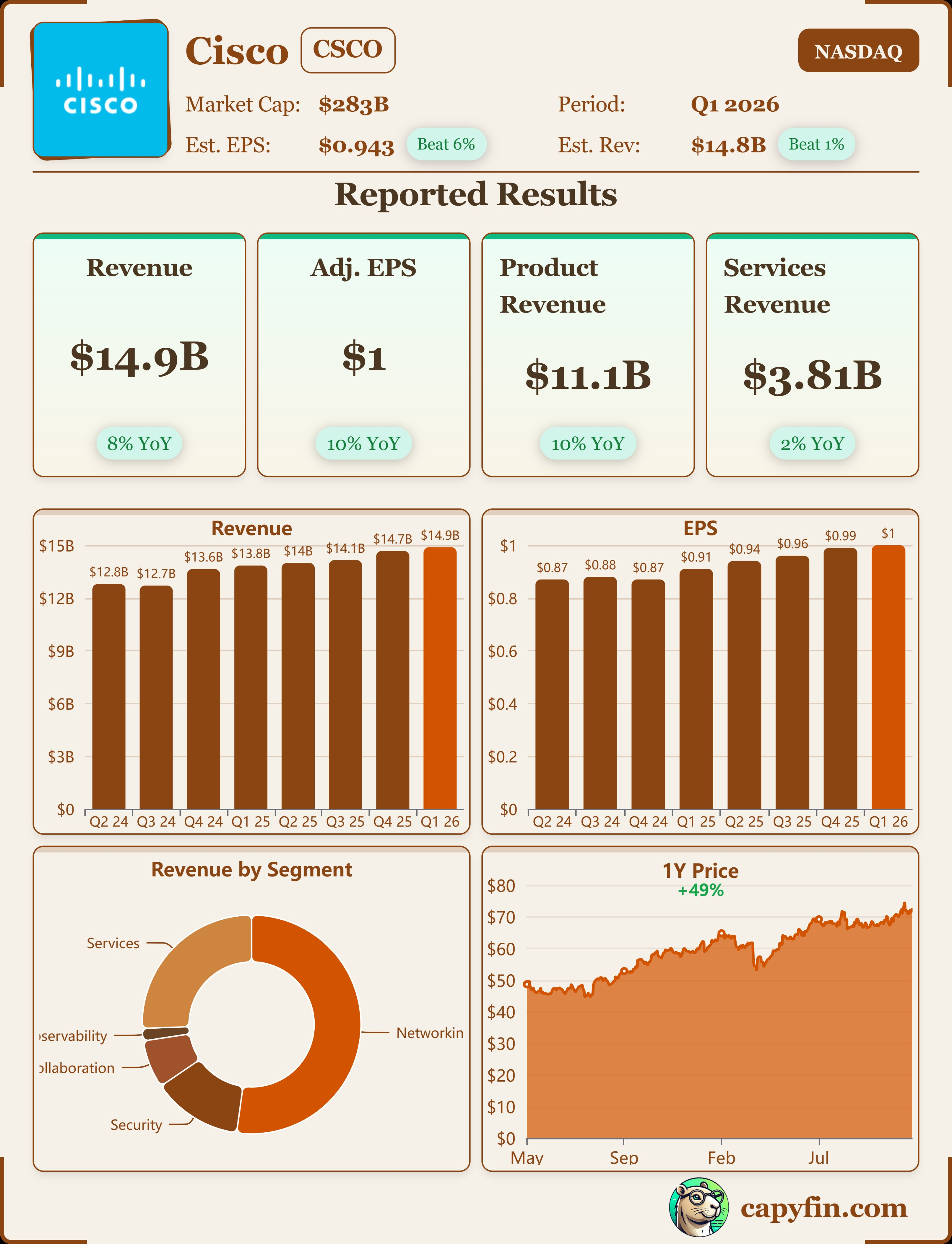 本季度总收入达到149亿美元,同比增长8%,超出了市场预期的147.7亿美元。Non-GAAP每股收益(EPS)为1.00美元,同比增长10%,同样高于0.98美元的共识预期。