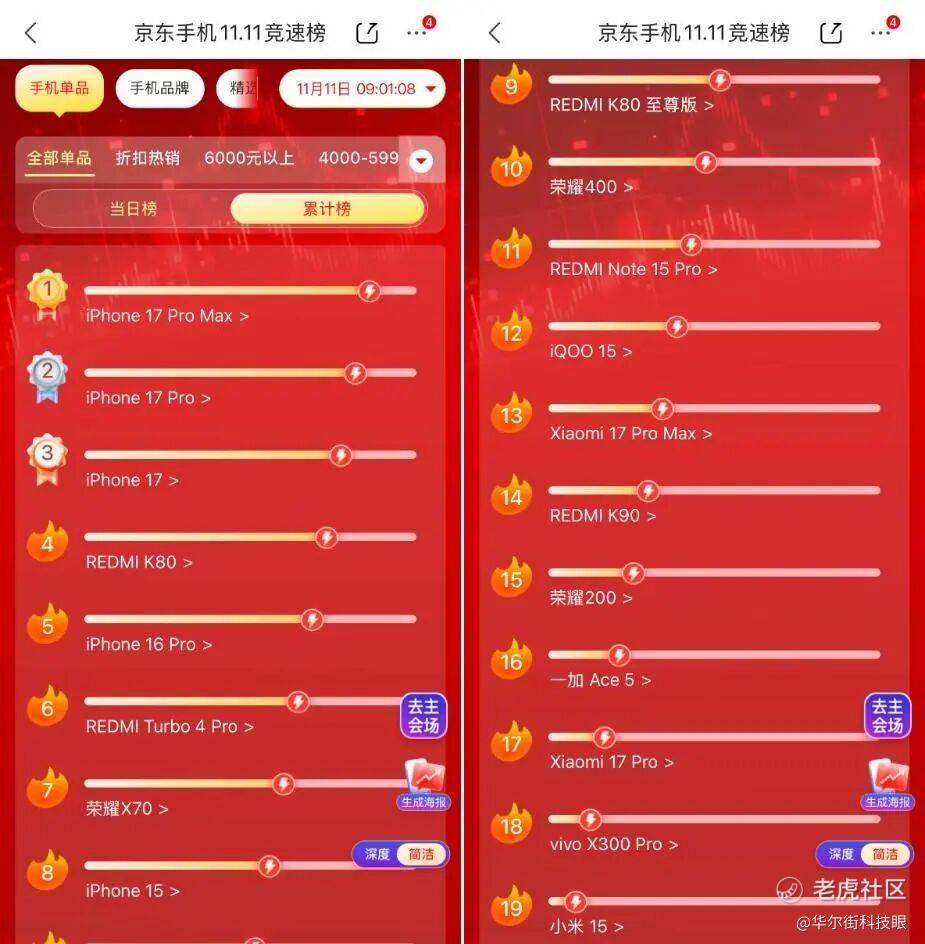截至11月11日早上9点(从10月25日0点开始计算),“京东手机11.11竞速榜”的累计榜排名TOP3分别为:iPhone 17 Pro Max、iPhone 17 Pro及iPhone 17,前十名中苹果占了一半,且最低起售价为3509.1元。反观安卓阵营,排名第五的Redmi K80起售价为1619.19元,溢价方面差距悬殊;小米17 Pro、vivo X300等安卓旗舰新机仅位列TOP20以内,凸显出苹果在高端市场的绝对统治力。