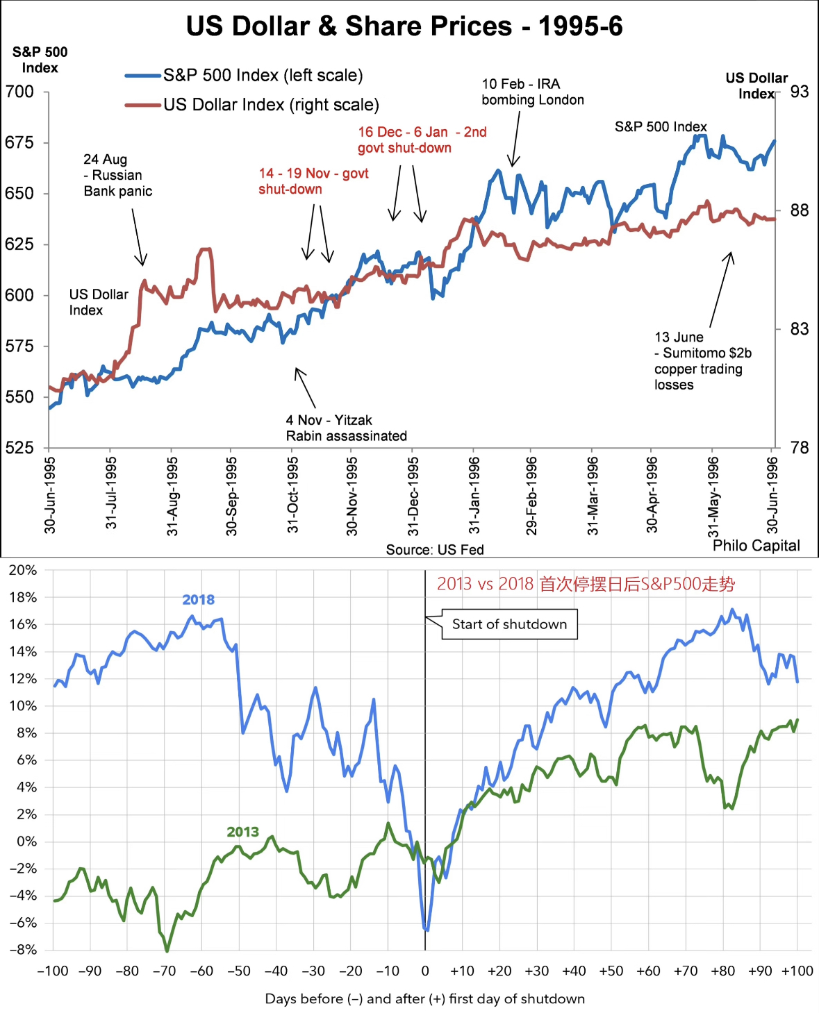 1995-1996,两次停摆累计26天,停摆结束后标普500指数一年内涨约22%,同期美元指数也稳步上涨;