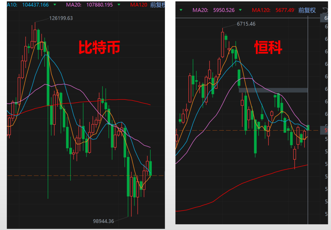 10月之后中国资产回调,尤其是受美元流动性影响比较大的港股回调幅度比较大。最近我经常看比特币的走势,跟恒科走势如出一辙: