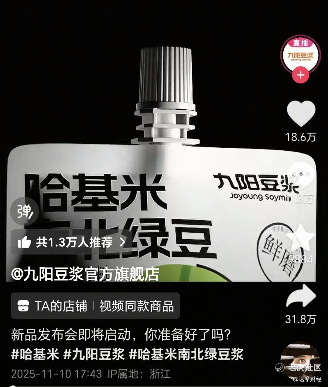 九阳豆浆及时抓住了这一热点,今年“双十一”当日,九阳豆浆推出了“哈基米南北绿豆浆”产品,仅仅3天便实现爆火。