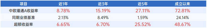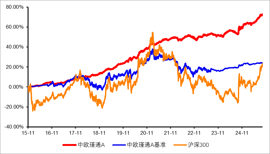 数据来源:基金定期报告,截至2025/09/30。基金的过往业绩并不预示其未来表现,基金管理人管理的其他基金的业绩并不构成基金业绩表现的保证。中欧瑾通灵活配置混合A的成立以来涨跌幅72.81%,同期业绩比较基准24.14%。2020-2024年基金涨跌幅和同期基准表现为12.74%/13.5%,6%/-1.21%,-1.33%/-10.8%,2.87%/1.39%,7.35%/5.89%。历任基金经理:华李成20180329-管理至今,朱晨杰20170407-20180821,张跃鹏20151127-20200709,刘德元20151127-20170627,吴启权20151117-20161222,孙甜20151117-20161222。本基金于2016年9月修改投资范围,增加政府支持机构债、国债期货、股票期权为投资标的。本产品于2020年10月修改投资范围,增加存托凭证为投资标的。详阅法律文件。
