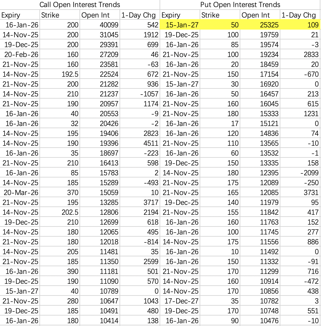 从PLTR未平仓排序来看,看跌期权持仓第一仍然是 $PLTR 20270115 50.0 PUT$,但未平仓只有2.5万手,远远低于5万手,所以可以确定大空头确实平仓了。