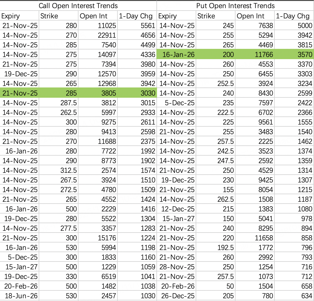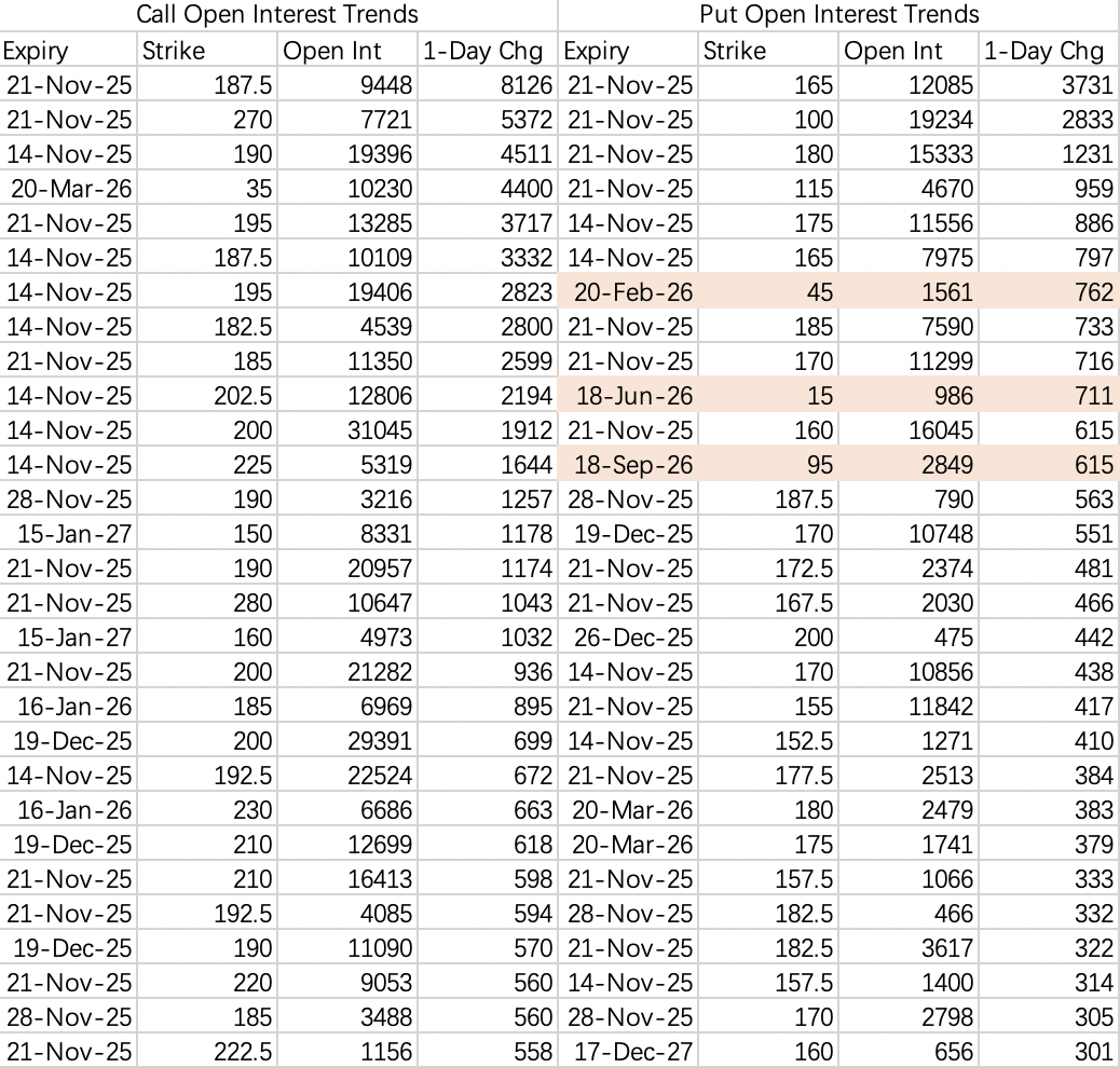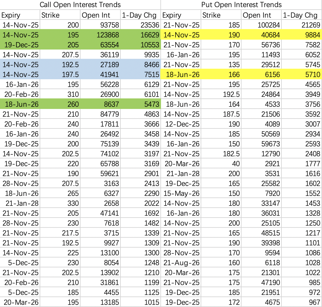 下周英伟达财报,值得注意21号到期185看跌期权未平仓量达到10万手 $NVDA 20251121 185.0 PUT$ ,近两日内大量开仓,方向有多有空。提前跌也好,预计财报没什么亮点。
