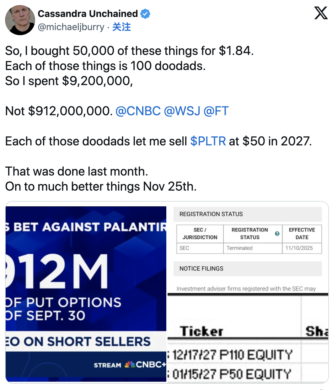 并同时澄清自己的空头头寸是什么:5万手 $PLTR 20270115 50.0 PUT$ 以及1万手$NVDA 20271217 110.0 PUT$