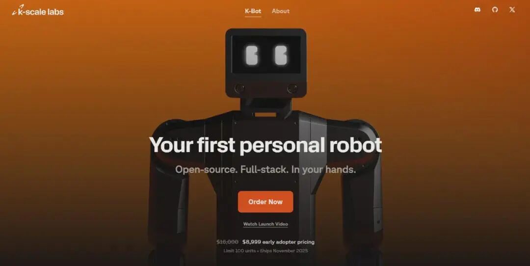 7月,K-Scale Labs发布最新一代低成本开源双足人形机器人K-Bot,原价为16000美元(约合11.5万元人民币),早鸟预定价为8999美元(约合6.5万元),仅限前100台预购订单,最早发货时间为2025年11月。