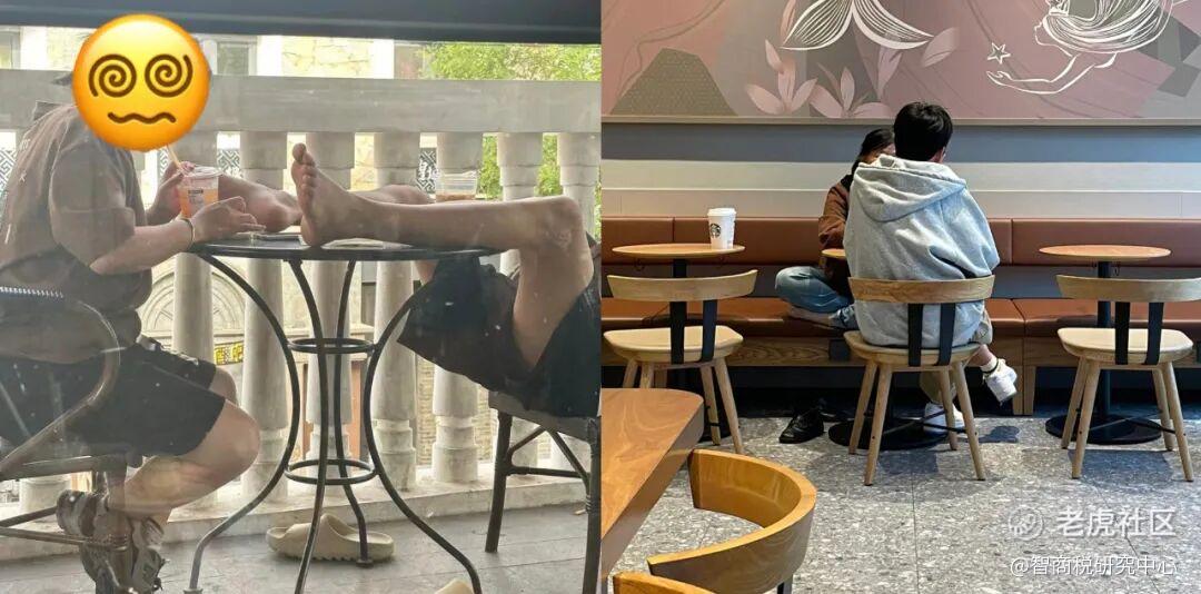 比如,有人将双脚放在店外的桌子上,试图让对面嗅到身体的芬芳;还有人在座位上脱鞋、盘腿一气呵成,将咖啡店演绎出了农村大炕的画风。