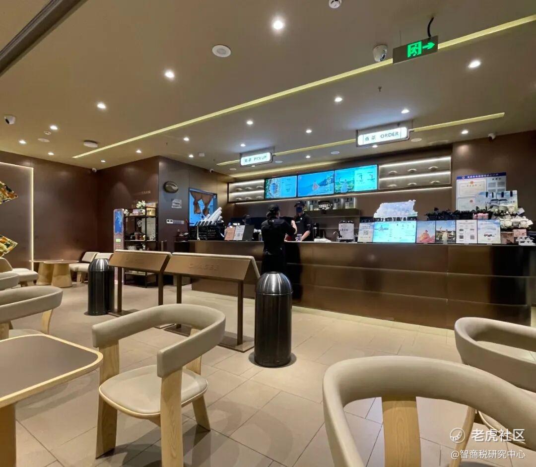 比如,在越来越多的商场里面,霸王茶姬开始与星巴克做邻居,不仅店面规模上向它看齐,门店装潢设计等方面,也更加贴近社交、办公等场景。
