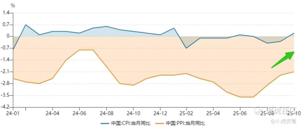 不仅如此,宏观数据持续改善强化了经济企稳预期。国家统计局数据显示,10月CPI同比转涨0.2%,结束此前连续三个月的下跌;同时,PPI环比转正,同比降幅收窄至-2.1%,为三个月来最小。这些数据表明需求端逐步修复,通缩担忧稍有缓解。在此背景下,周期板块率先受益,有色金属和化工等行业板块受到资金青睐,估值修复空间正被重新定价。