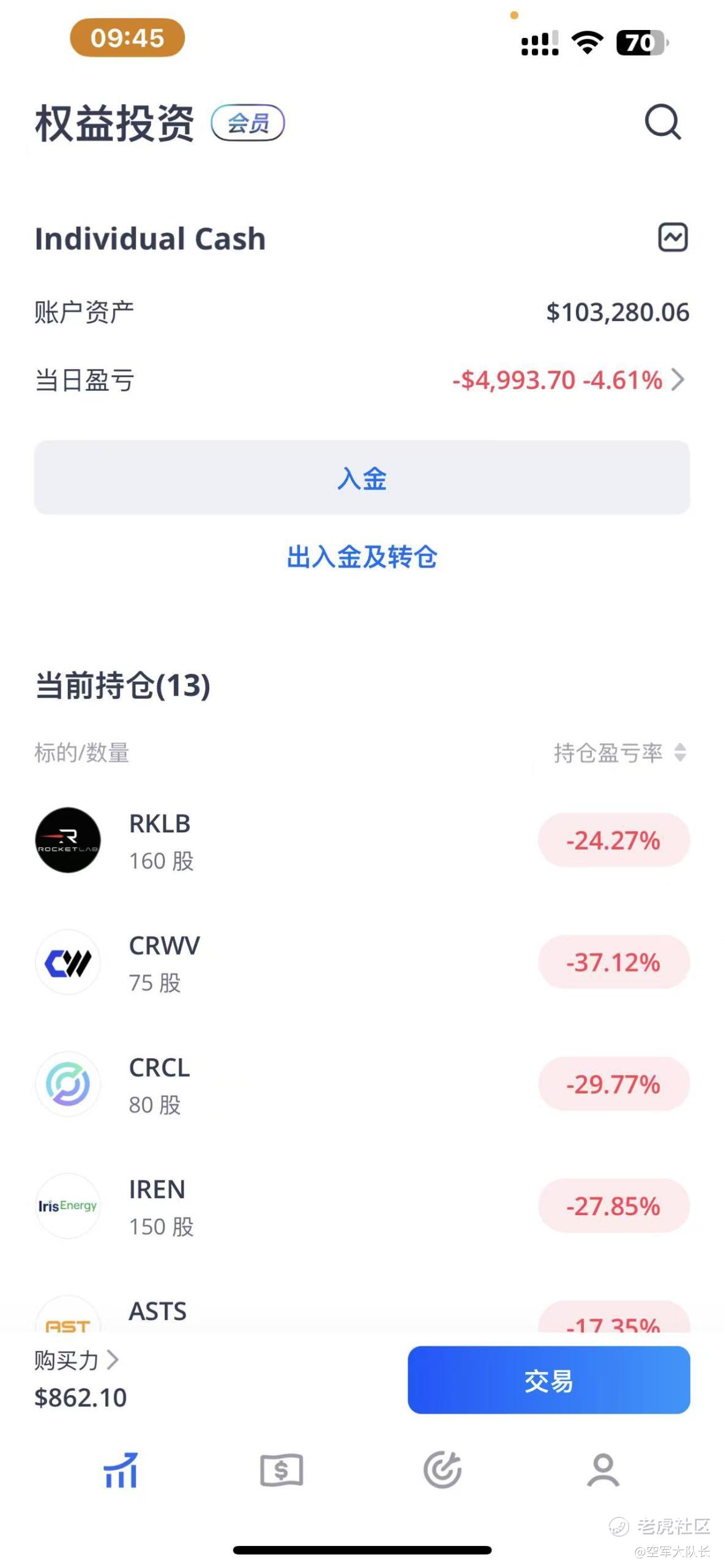 这是我的长线账户,现在只有10.3万美元了,这四个半月白干了,后面很可能要亏损了,现在亏得最多的就是NBIS,IREN,CRWV,CRCL,这四个不是云服务就是比特币,不过我也不担心,特朗普后面会出政策扶持这个行业的,就算万一不行了,我还有其他九个股票涨起来也一样,这就是买得多的好处,一两个行业不好,我根本不着急,我有百分百的信心这个账户后面会赚钱,我不马后炮,我天天发实盘,就算天天亏得这么惨,我也是天天发,大家现在也可以抄我的底了,机会给你们了,不要到时候涨起来了又后悔。
