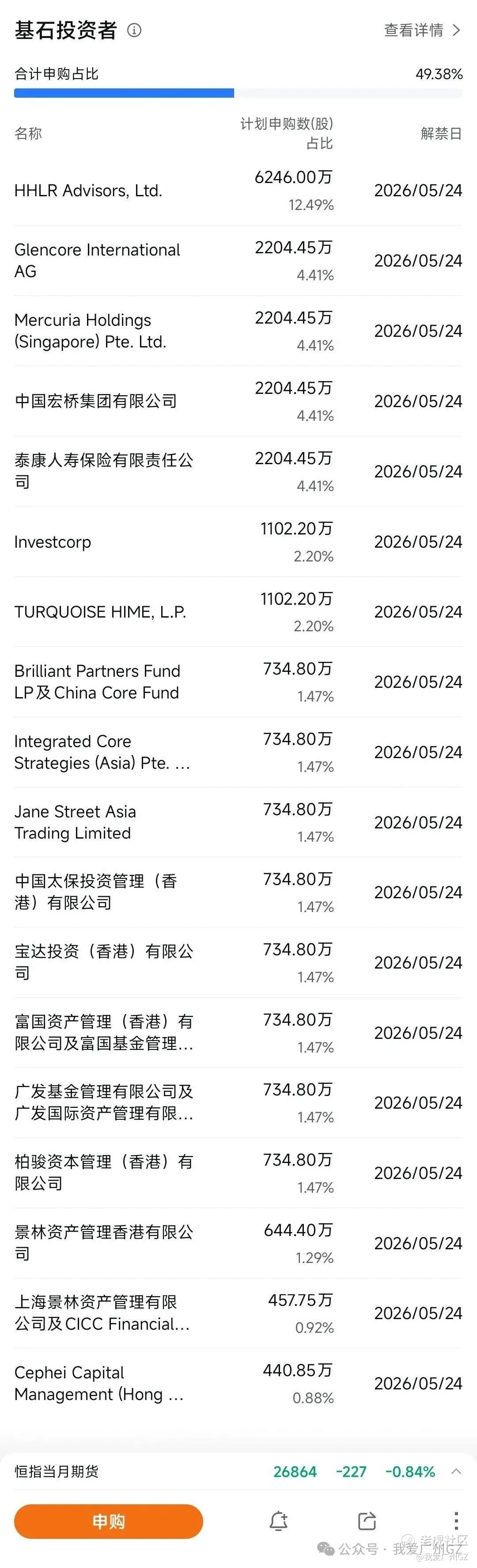 看看这基石名单:HHLRA (高瓴)、中国宏桥、嘉能可 (Glencore)、摩科瑞 (Mercuria)、泰康人寿...拿走了49.38%的货