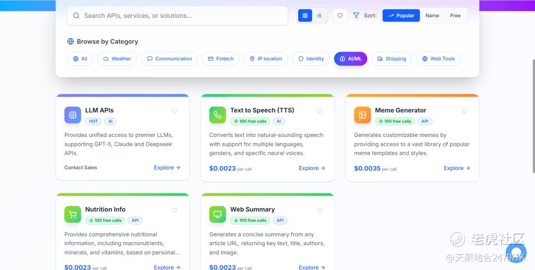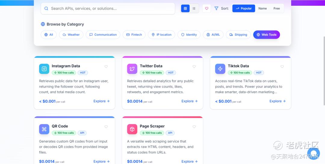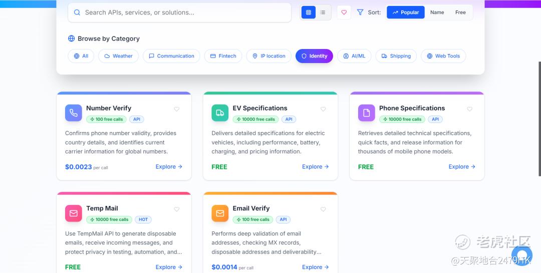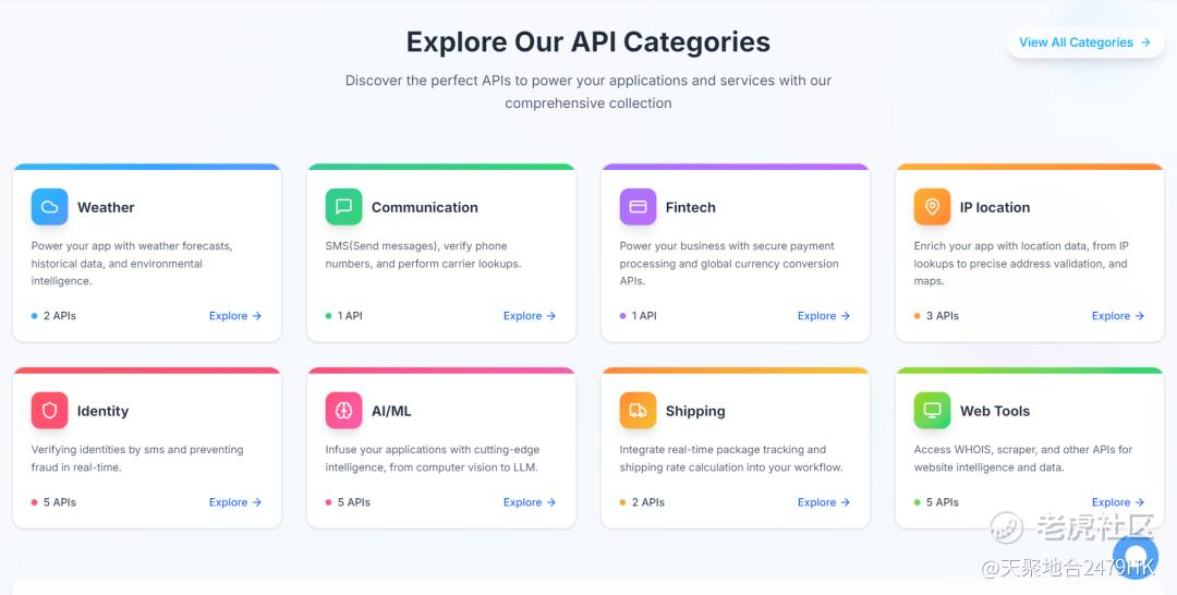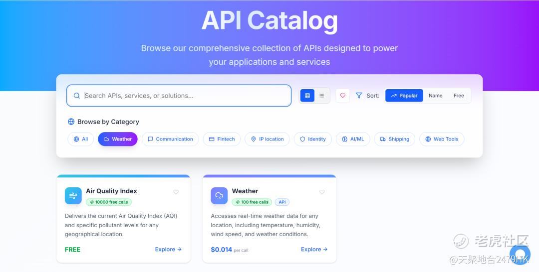 目前,JuheAPI 中热门 API 大致可分为 Weather、Communication、Fintech、IP & Location、Identity、AI / ML、Shipping、Web Tools 八大类、300+API: