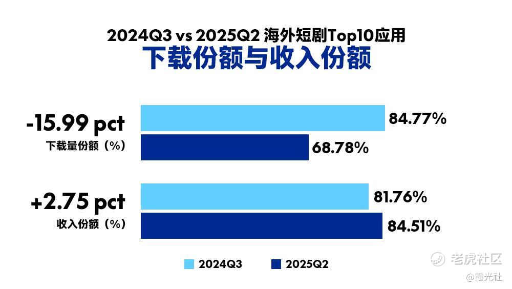 海外短剧市场特点是用户触达趋于分散,但利润愈发向头部集中。相较于2024年第三季度,2025年第二季度,海外短剧Top10应用的下载份额下降约16个百分点,而收入份额反而提升近3个百分点,印证了头部平台强大的商业化能力与马太效应。