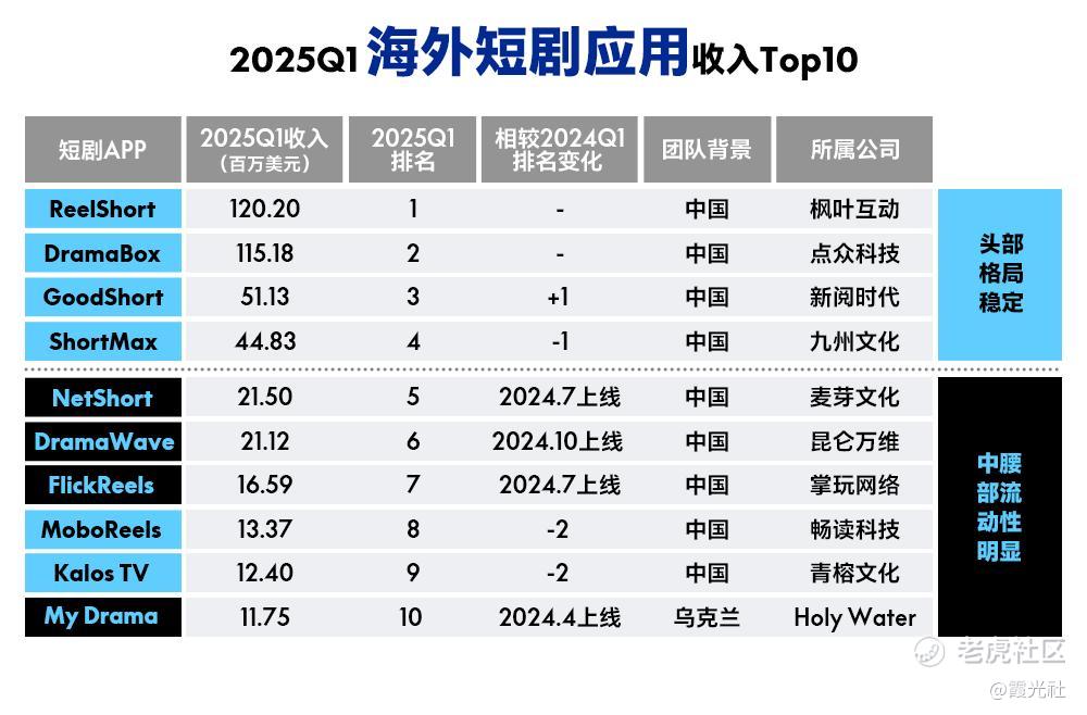 根据“短剧自习室”的统计,在全球短剧应用内购收入排名前50的产品中,由中国企业开发的超过40款,其总收入贡献占比高达93%以上。而2025年第一季度海外短剧应用收入前10名基本全被中国企业霸屏。