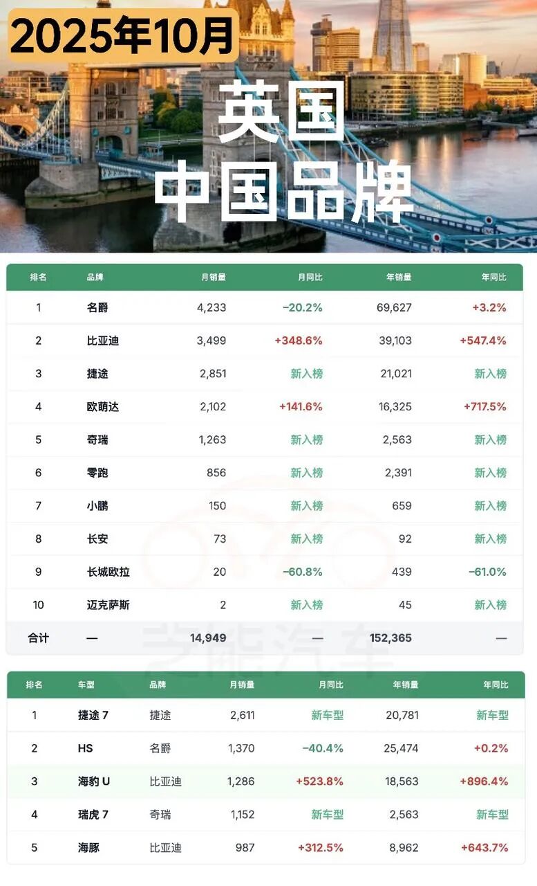 从整体结构来看,中国车企在英国市场形成了多层次布局: