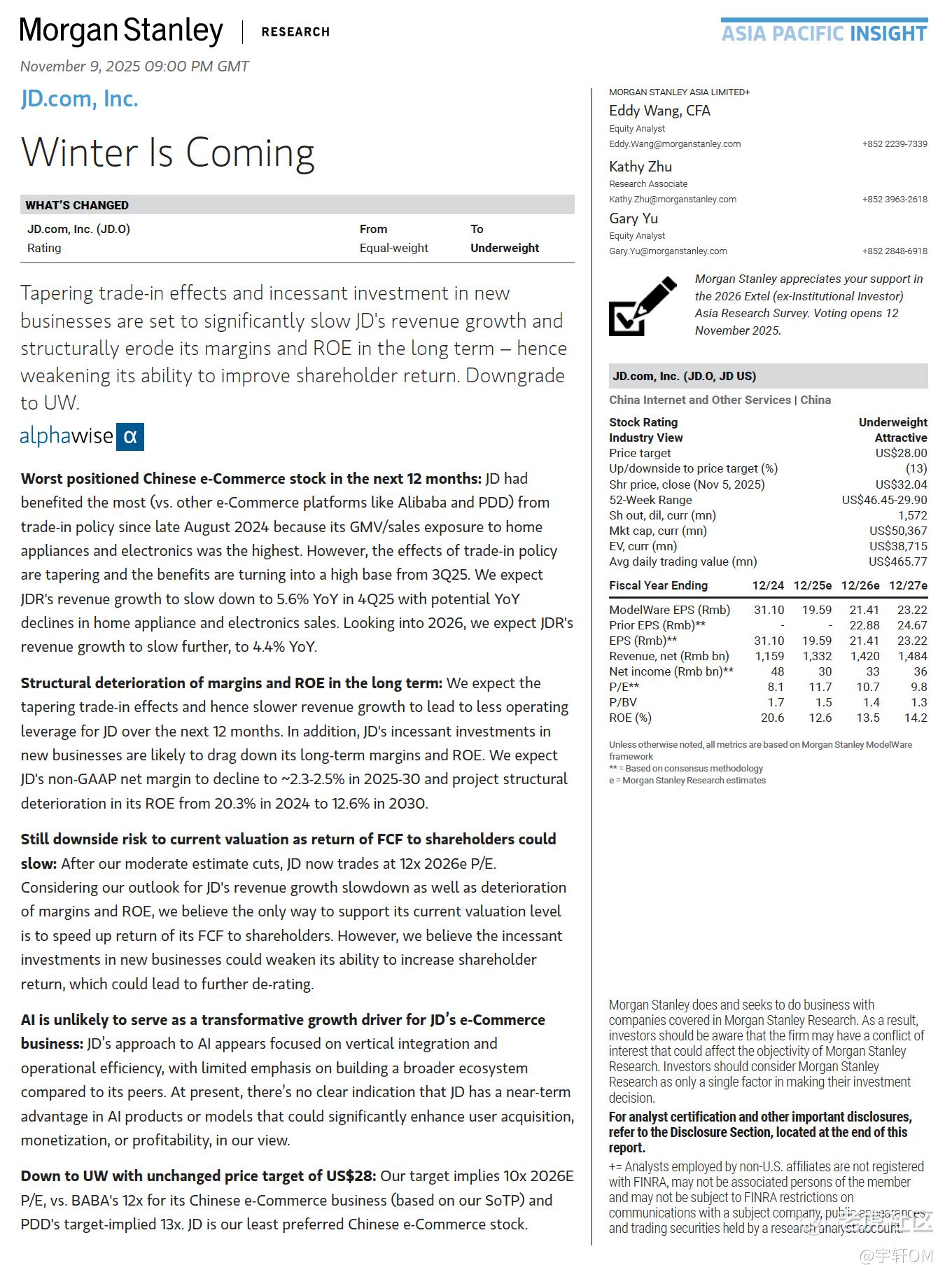 摩根士丹利对此给出了冰冷的预测:JD的收入增速将急剧放缓至个位数,预计第四季度同比增速仅为5.6%...2026年更可能进一步放缓至4.4% ("We expect JDR's revenue growth to slow down to 5.6% YoY in 4Q25... Looking into 2026, we expect JDR's revenue growth to slow further, to 4.4% YoY") 。