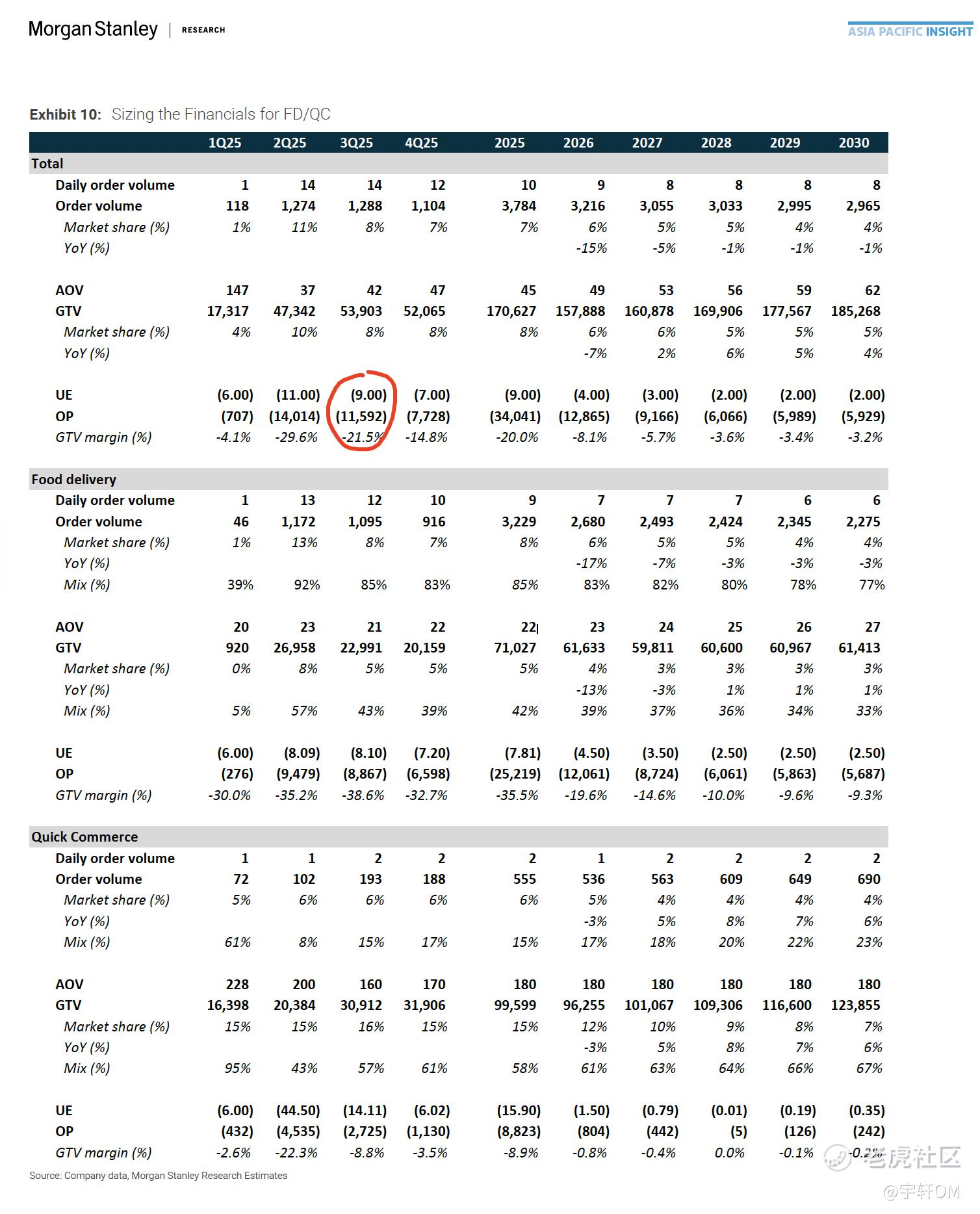 基于规模效应的缺乏和生态的恶化,摩根士丹利给出了一个惊人的亏损预测:JD即时零售业务的单位经济模型,亏损高达“9元”, 并预计2025年该业务全年总亏损将达“340亿元” ("loss in FD+QC at Rmb34bn in 2025")。