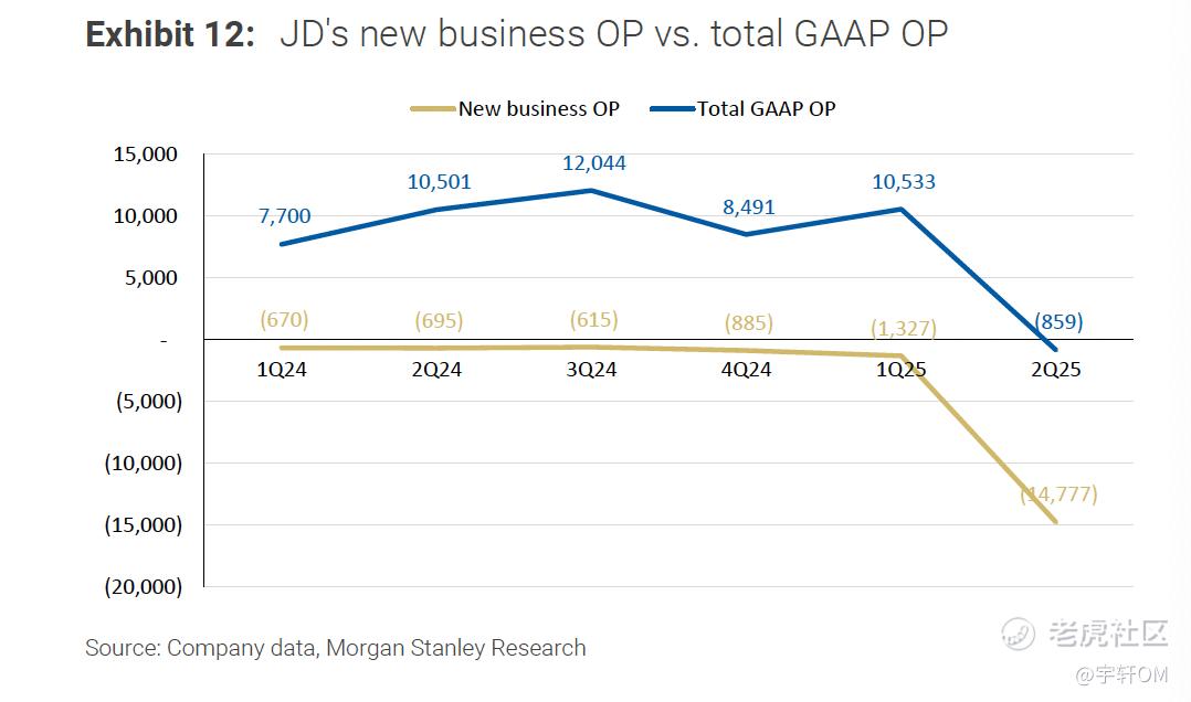 即时零售“血海”中的份额萎缩:即时零售正变成一场“绞肉战”。大摩估计,仅在第三季度,阿里和美团在即时零售领域的投入就分别高达“350-400亿元”和“180-190亿元”。在如此激烈的“绞杀”中,JD的“烧钱”并未换来增长。大摩发现,JD的市场份额已从第二季度的11%迅速“掉到8%” ("JD's FD+QC order share fell to 8% in August and September... vs. 11% in 2Q25") 。新业务(京喜、海外、外卖)的亏损如同“无底洞”,Q3亏损高达157亿,环比上季进一步增多约10亿。