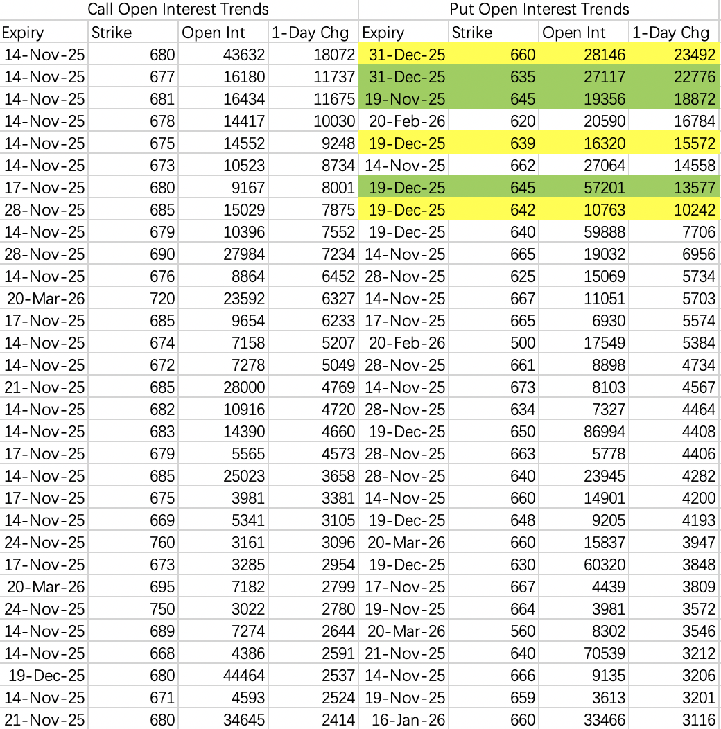 对于640附近多空有争议,空单比如买入639put $SPY 20251219 639.0 PUT$ ;多单有卖出11月19日到期645put $SPY 20251119 645.0 PUT$ ,值得注意的是11月19日盘后是英伟达财报。