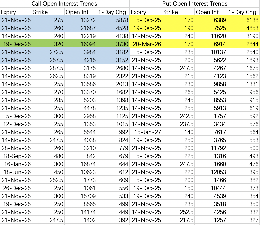 因为之前有跳涨缺口,所以缺口看空大单比较多: $AMD 20251205 170.0 PUT$ $AMD 20251219 190.0 PUT$ $AMD 20260320 170.0 PUT$