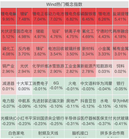 根据Wind的热力图,锂电池、电解液、锂矿、光伏、固态电池等板块涨幅居前。