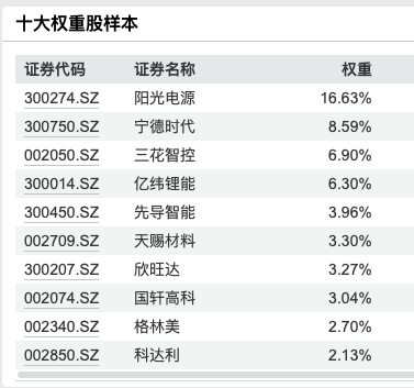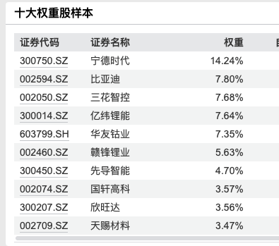 根据Wind,国证新能源车电池指数(980032.CNI)前十大重仓股分别是宁德时代、比亚迪、三花智控、亿纬锂能、华友钴业、赣锋锂业、先导智能、国轩高科、欣旺达、天赐材料。