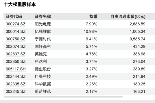根据Wind,国证新能源电池指数(980027.CNI)前十大重仓股分别是阳光电源、亿纬锂能、宁德时代、国轩高科、英维克、科达利、德业股份、巨星科技、科华数据、蔚蓝锂芯。