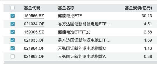 其中,ETF产品有2只,其中一只易方达旗下的储能电池ETF(159566),当前规模30亿元,另一只是储能电池ETF广发(159305)。