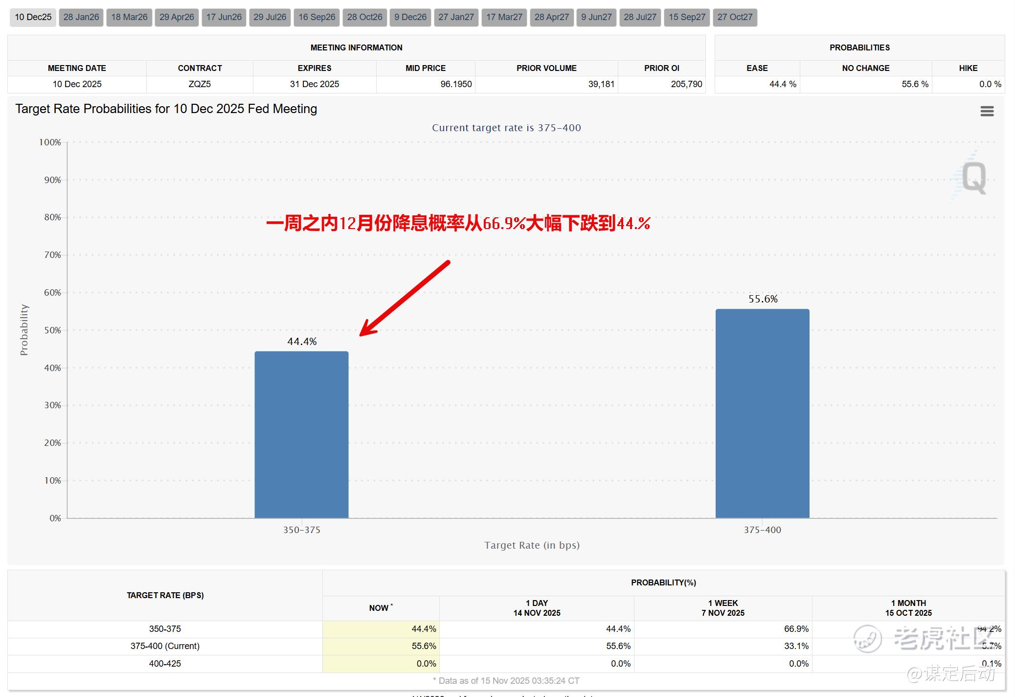 在CME FedWatch中,一周之前,市场给 12 月降息的概率大概是三分之二;现在,12 月降息25bp对应的 3.50–3.75%区间,只剩44.4%左右——也就是“不降”的概率反而成了大头。