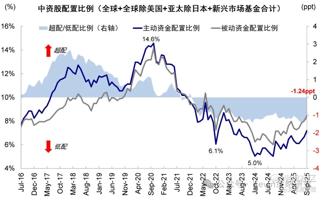 从下图中看,全球基金对中资股的配置比例还是低配1.24%;尤其是主动资金低配约2%,被动资金低配约1%。