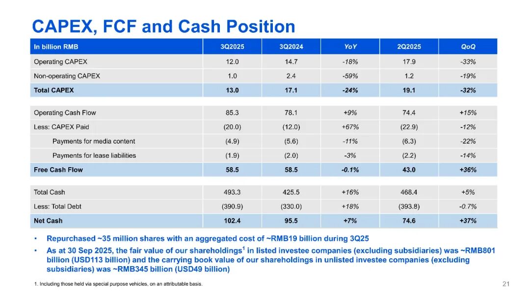 截止2025年Q3,于上市投资公司(不包括附属公司)权益的公允价值为8008 亿元,2025年Q2是7143亿元。