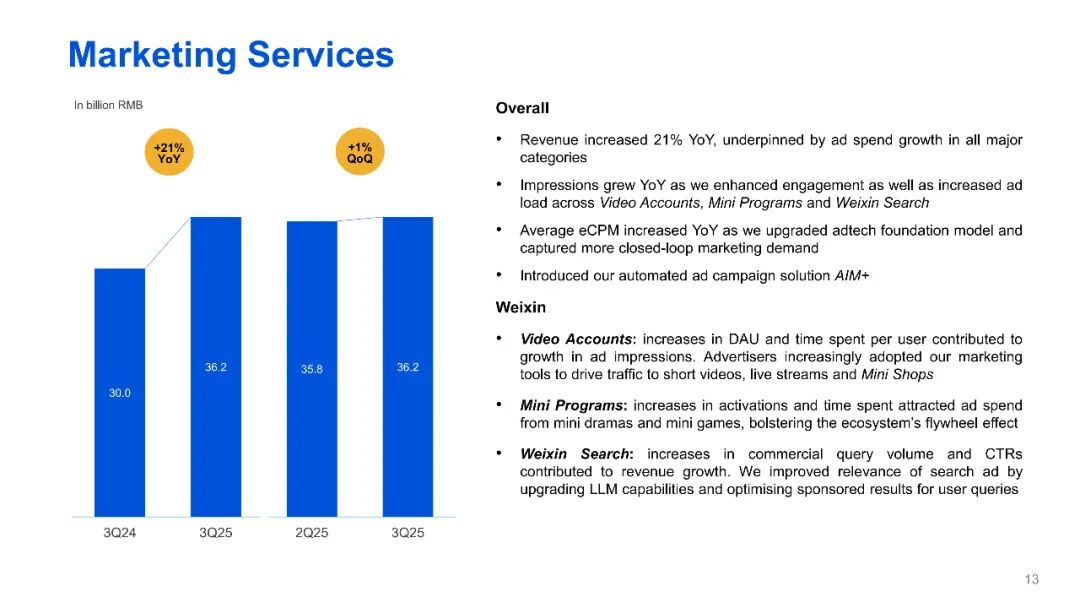 - 随着视频号、小程序及微信搜索的用户参与度提升与广告加载率增加,展示量实现同比增长