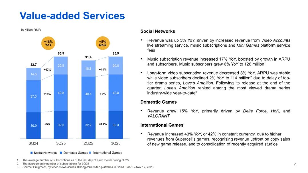 - 增值服务同比+16%(社交网络同比+5%、国内游戏同比+15%、国际游戏同比+43%),环比+5%(社交网络环比+0.2%、国内游戏环比+6%、国际游戏环比+11%)