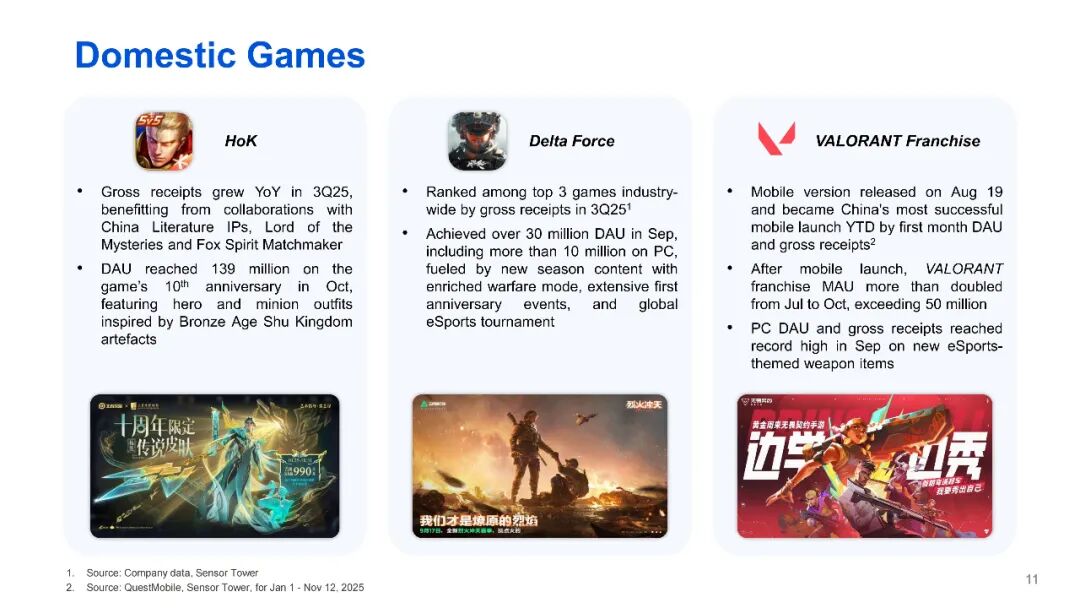 - 收入同比增长+15%,主要由《三角洲行动》、《王者荣耀》及《无畏契约》驱动