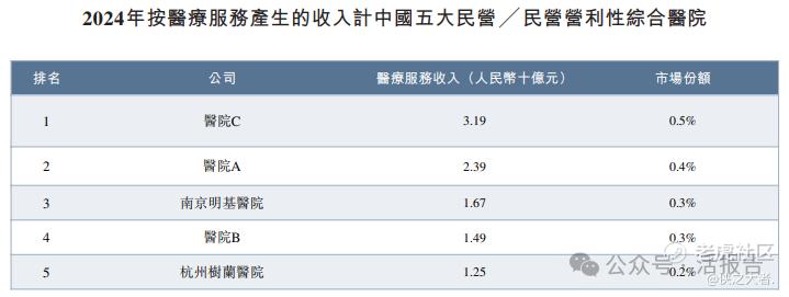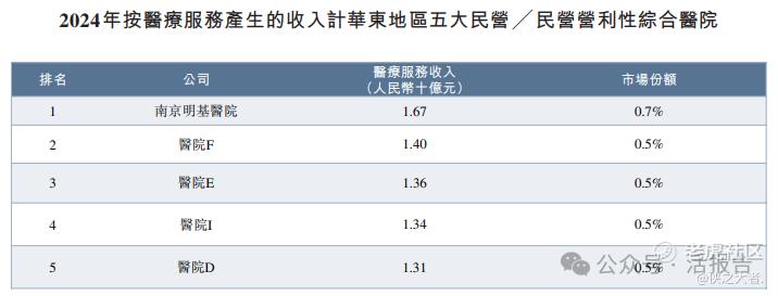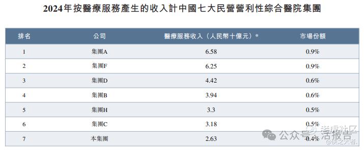 根据弗若斯特沙利文的数据,以2024年总收入计,公司是华东地区最大的民营营利性综合医院集团,于华东地区的市场份额为1.0%;以相同口径计,公司在全国民营营利性综合医院集团中排名第七,于中国的市场份额为0.4%;以2024年的床均收入计,公司在中国内地所有民营营利性综合医院集团中排名第一。