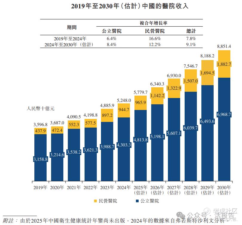 根据弗若斯特沙利文(Frost & Sullivan)的数据,民营医院的收入由2019年的人民币4,379亿元增至2024年的人民币9,447亿元,2019年至2024年的复合年增长率为16.6%,预计2030年达到人民币18,827亿元,2024年至2030年的复合年增长率为12.2%。