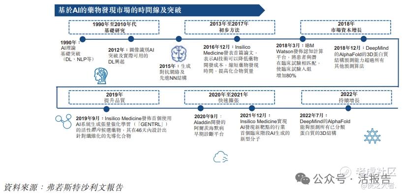 根据弗若斯特沙利文(Frost & Sullivan)的报告,于1990年代初,基础AI研究取得突破,于未来二十年带来各种实际应用,如ImageNet、GANs、transformers及其他先进神经网络结构。从那时起,将人工智能技术应用于药物发现的可能性得到了深入的探索,并带来庞大的商机。