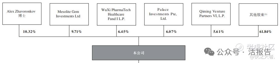 公司创始人Alex Zhavoronkov博士持股10.32%;WPC-SEA II Cayman GP LLC 通过 Mesolite Gem Investments Ltd持股9.71%;药明康德(2359.HK;603259.SH)通过WuXi PharmaTech Healthcare Fund I L.P.持股6.45%;淡马锡通过Palace Investments Pte, Ltd.持股6.07%;启明创投通过Qiming Venture Partners VI, L.P持股5.61%;