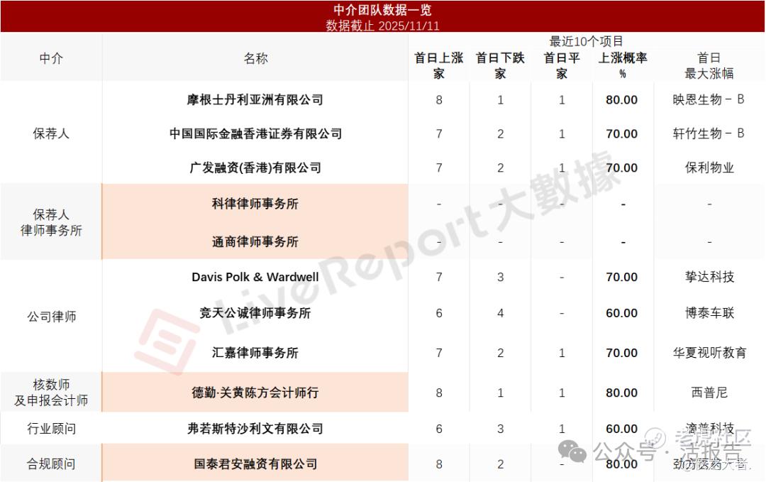 据LiveReport大数据统计,英矽智能中介团队共计11家,其中保荐人3家,近10家保荐项目数据表现良好;公司律师共计3家,综合项目数据表现尚可。整体而言中介团队历史数据表现比较好。