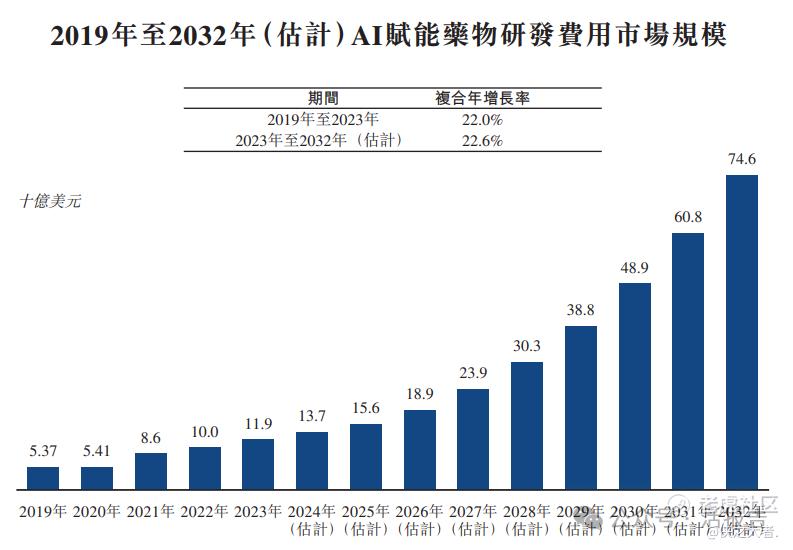 根据弗若斯特沙利文(Frost & Sullivan)的报告,预计全球AI赋能药物研发费用市场规模由2023年的119亿美元增加至2032年的746亿美元,复合年增长率为22.6%。
