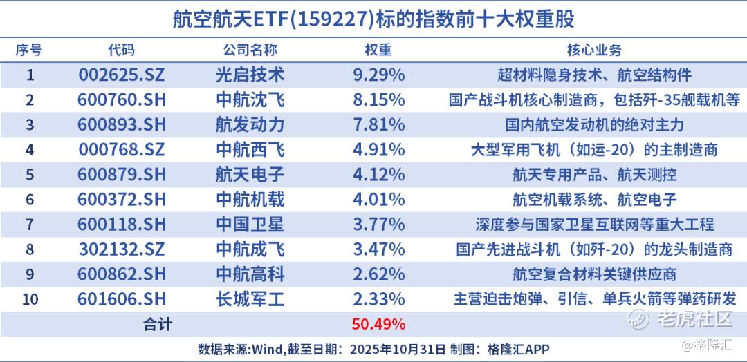 航空航天ETF(159227)的前十大权重股清晰地展现了航空航天产业的核心链条,从最前端的航空发动机(航发动力)、航空材料(中航高科、中航重机),到关键的机载系统(中航机载),再到最终的飞机整机(中航沈飞、中航西飞、中航成飞)和航天系统(航天电子、中国卫星),使得该ETF能够深度绑定军机换代、大飞机、低空经济和卫星互联网等国家战略性需求,契合"航天强国"的导向。