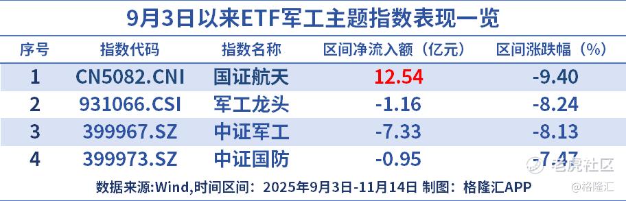 值得一提的是,军工板块自9月3日以来持续回调,国证航天、军工龙头、中证国防、中证军工指数期内跌幅超7%,但国证航天指数是唯一获得资金“越跌越抄底”的军工主题指数,期内相关ETF净流入额超12亿元。