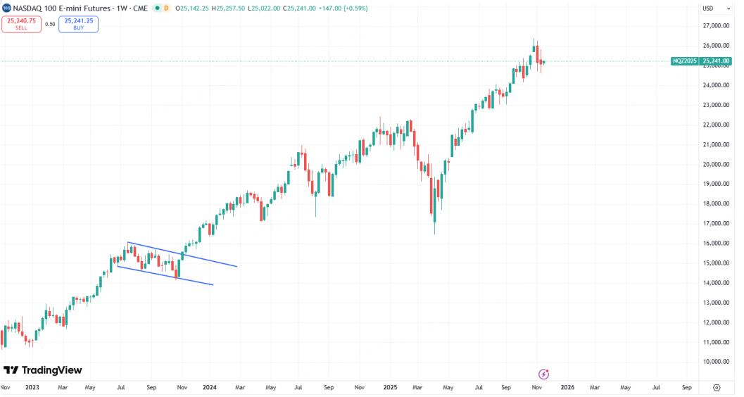 最后回到美股,作为风险资产最重要的抗跌大哥,指数之间上周其实已经出现了一定程度的分化。标普出现了孕线组合,明摆着在等待本周数据和消息面之后确认方向。而纳指则因为英伟达上周表现不佳而已经有日线近期新低的情况(英伟达周线也是孕线)。参考前两个跨市场走势,显然美股也在等待一个契机下杀。按照高盛的说法,过去两周,包括AI投资前景、美联储降息预期以及经济增长持续性这股市三大核心牛市叙事均遭遇质疑。这其中美联储的重要性个人认为有限,而AI是重中之重。故而本周的财报和经济数据之后到底如何走,就可以定调年内剩余时间的方向了。基本上下破上周低点就是开始调整的信号。不过从强弱级来说,美股依然大概率不会是最差的那个。从波动率和潜在风险来说,黄金和白银或许是短期压力更大的。另外再提一嘴英伟达,带头大哥本周跌破176的话不仅不利于其自身,对美股的影响预计也会不小,值得关注再关注。