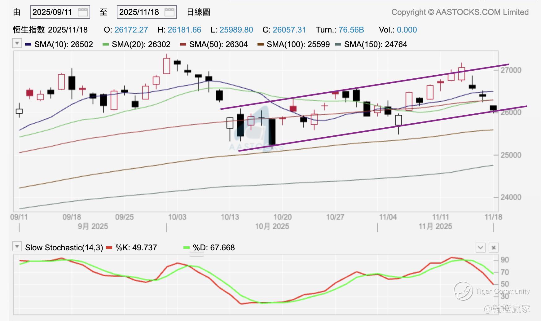 真系想顺返个技术走势嚟出好仓架,小时图Slow STC(14.3)准备触底,日线图画到「上升通道」指数坐住底线,再加埋26000点呢啲齐点数关口位...奈何现价同上方熊证都实在太远。