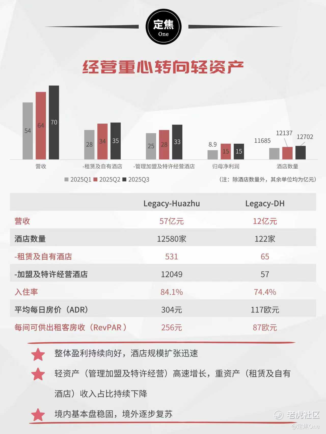 报告期内,总收入达70亿元,同比增长8.1%,超过此前业绩指引上限。其中,华住中国收入同比增长10.8%至57亿元;Legacy-DH(指欧洲业务)收入为12亿元,受汇率及区域市场波动影响,同比下降3.0%。