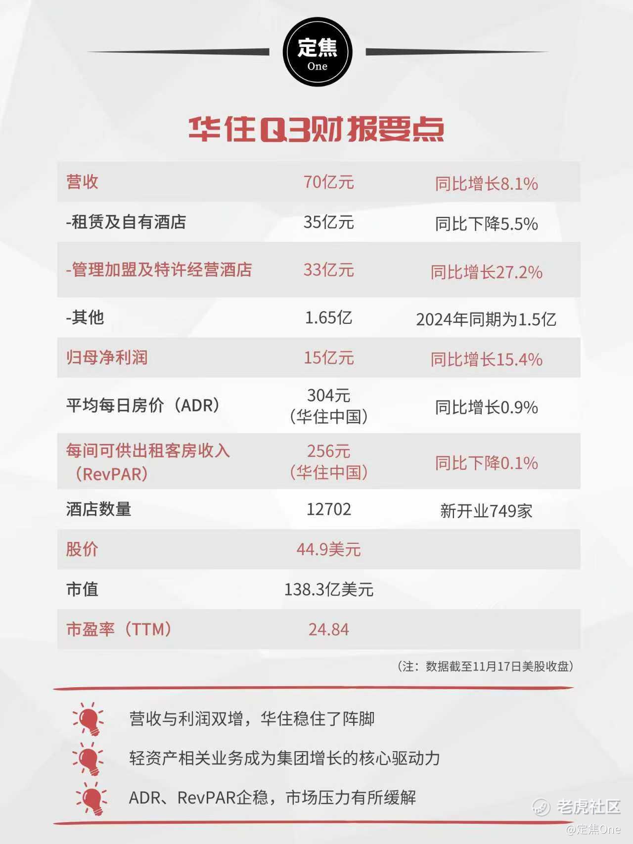 11月17日,华住集团公布了截至2025年9月30日止的第三季度未经审核财务业绩。整体来看,在宏观需求温和复苏与轻资产战略深化的背景下,稳住了基本盘。