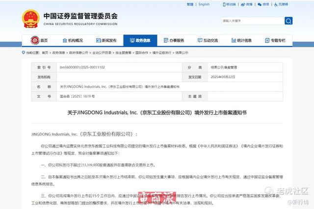 此前,公司已获中国证监会境外上市备案。前不久,中国证监会国际合作司发布关于JINGDONG Industrials, Inc.(京东工业股份有限公司)境外发行上市备案通知书。其中,京东工业拟发行不超过253,309,800股普通股,并在香港联合交易所上市。