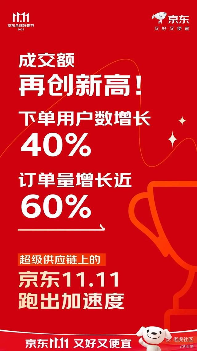 而用户的活跃,也给京东的双十一带来了新突破。据京东官方消息,截至2025年11月11日23:59,京东双十一成交额再创新高,下单用户数增长40%,订单量增长近60%。