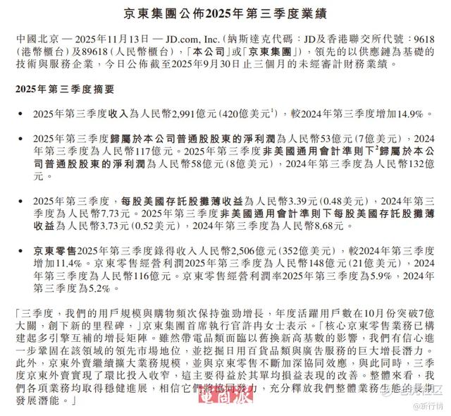 不久前,京东发布了2025年第三季度财报。财报显示,京东第三季度收入2991亿元,同比增长14.9%。