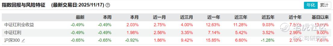 Wind数据显示,截至2025年11月17日,中证红利全收益指数近10年年化收益率达7.80%,超过沪深300的2.10%;进一步拉长时间,自2004年底指数基日以来,中证红利全收益指数取得了高达13.03%的年化收益率,大幅跑赢沪深300,为投资者带来了长期亮眼的回报(指数回报数据只代表过去,不预示未来变化)。